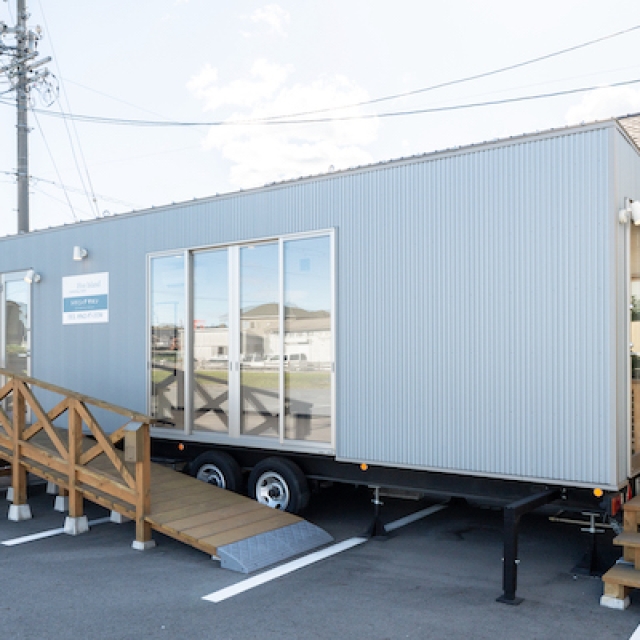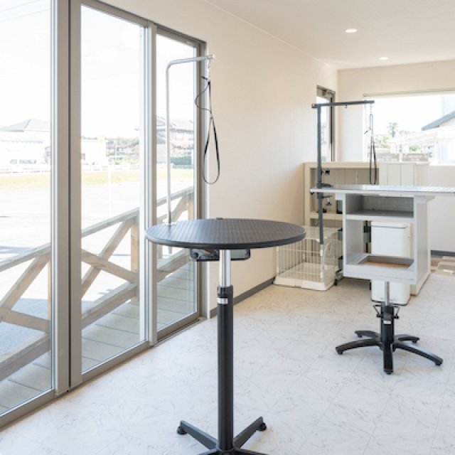広い駐車スペースを活用され設置されたトレーラーハウス内は静かで明るく開放的な空間となっており、ワンちゃんもリラックスしてカットを受けられます。