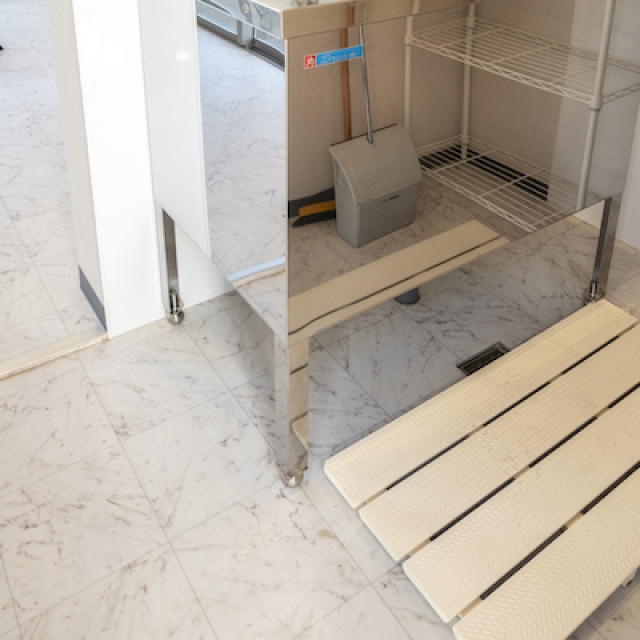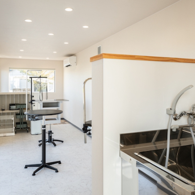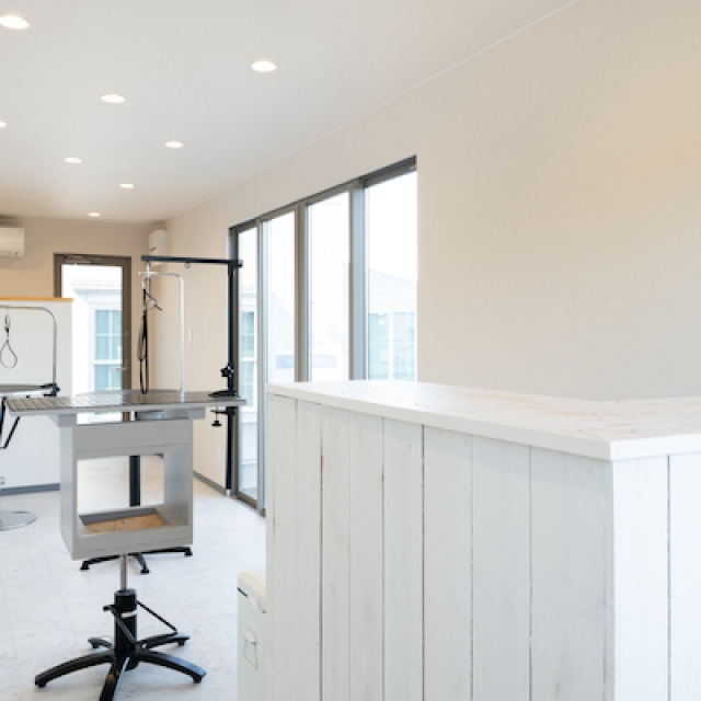 カットしたワンちゃんの毛がわかりやすくお掃除しやすいように、床と壁の間の巾木を濃い色のものにし、シャンプ時に床に落ちる水が排水しやすい様に傾斜をつけたいとのご要望をいただきました。