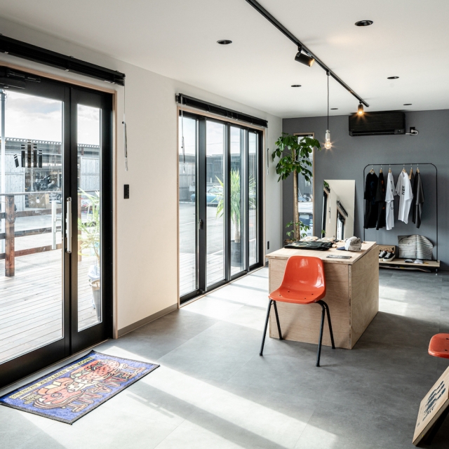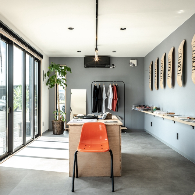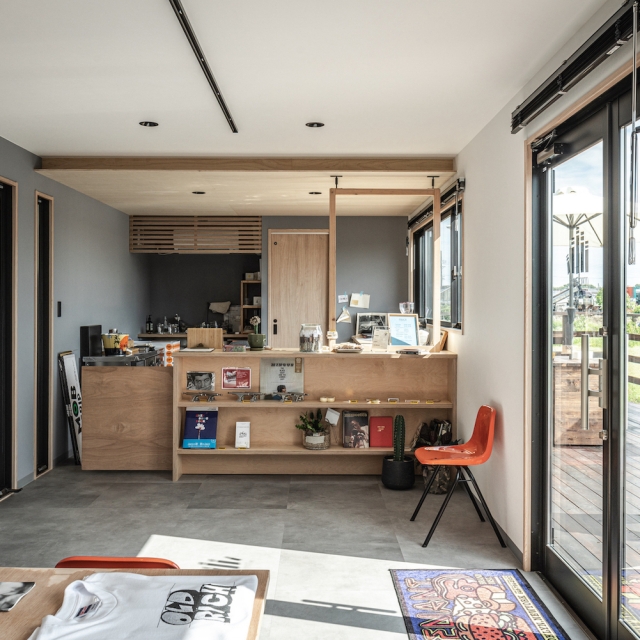 店内にてアパレルとドリンクの提供のカウンターと棚